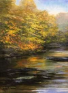 Peace of MindThis oil on canvas panel is one I did a few years ago, inspired by the glowing color on the banks of the Amicalola River here in North Georgia. The morning light was lighting up the fall trees like they were in flames, and the vivid color was reflected in the water. Rushing water completed the fantastic color palette of the scene by adding cool blues which contrasted with the orange of fall. It’s 12” x 16”.